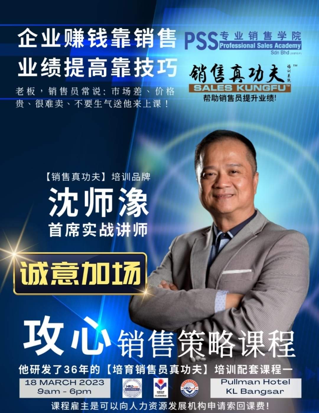 《攻心销售策略课程》 by admin | Mar 18, 2023 | 最新活动 「诚意加场18 March 2023」 企业赚钱靠销售、业绩提高靠技巧 ! 老板们, 销售团队业绩不理想时。。。 销售员都说: 经济不景气、市场差。。。不要生气, 送他来上课! 销售员常说: 价格贵、很难卖。。。不要失望, 送他来上课! 销售员惯说: 公司或上司都没有提供销售培训。。。不要浪费时间教他,送他来上课! 沈师潒实战讲师,研发了36年的「培育销售员真功夫」培训课程之一 《攻心销售策略课程》主讲: 沈师潒 实战讲师日期: 18 March 2023时间: 9.00am–6.00pm地点: Pullman Hotel KL Bangsar(5星级) ⚠注意⚠课程企业雇主是可以向人力资源发展机构 (HRD Corp)申请索回课费 ! 询问热线 +6016-4423 556 ← [销售真功夫]学习大会2018 「夺单成交」九步法 →